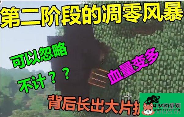 OK,现在看看第一阶段的枯萎风暴是什么样子的。事实上,枯萎风暴的第一阶段是普通的枯萎持有命令块,没有独特的地方,也不让玩家骑,但它会吸收所有的落物,真的扔多少,吃什么。等它吸收了足够多的方块,它就会成长到第二阶段。与第一阶段相比,第二阶段的凋零风暴已经不同了,因为它背后会长出大量的盔甲,但在这个时候,本质上只是血量变得多了一点,可以忽略不计!
