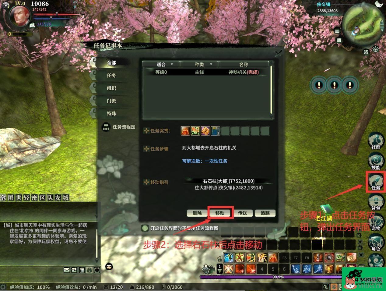 这个时候,人物面前会有一个角色NPC玄剑门弟子可以通过对话获得第一个主要任务,跟随指导将逐步执行三个任务,即第一次涉及江湖、玄剑混乱和神秘机构。