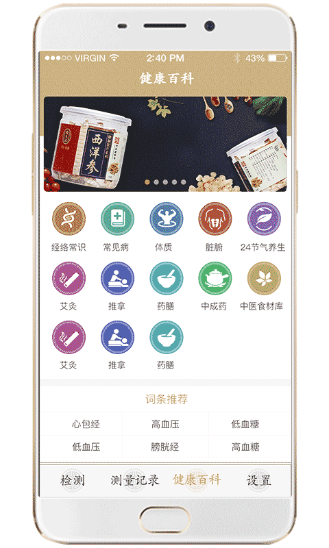 内容提要 光感元件记录信号采集器通过光感元件记录透过手指的光强度变化,从中获取心脏搏动及血管容积周期性变化信号,信号通过移动设备端发往云端服务器。服务器运用独特算法,对心包、肝、肾、脾、肺、胃、胆、膀胱等经络的强弱进行解读,并根据个人情况给出调理及治疗建议。 功能概述 1.治未病,拒疾病于千里之外 2.糖尿病风险提示,轻松享受每一天 3.熟知8条经络健康状况,让您对自己的身体了如指掌 4.监测女性生理期及孕期状况,摆脱您的尴尬境遇 5.测量中医保健方法对身体的改善效果,您看得见的健康趋势