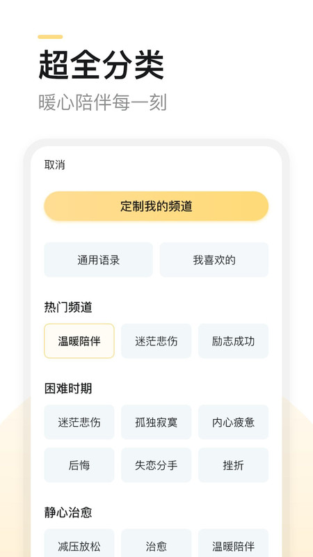 得言拥有*的主题,分析出每个人在生活中可能遇到的种种问题,并暖心整理出困难时期、静心治愈、个人成长,工作与职场、人际关系、美文金句、灵感等等六十多类的语录,希望在你*需要它们的日子里,它们随时可以陪伴着你。