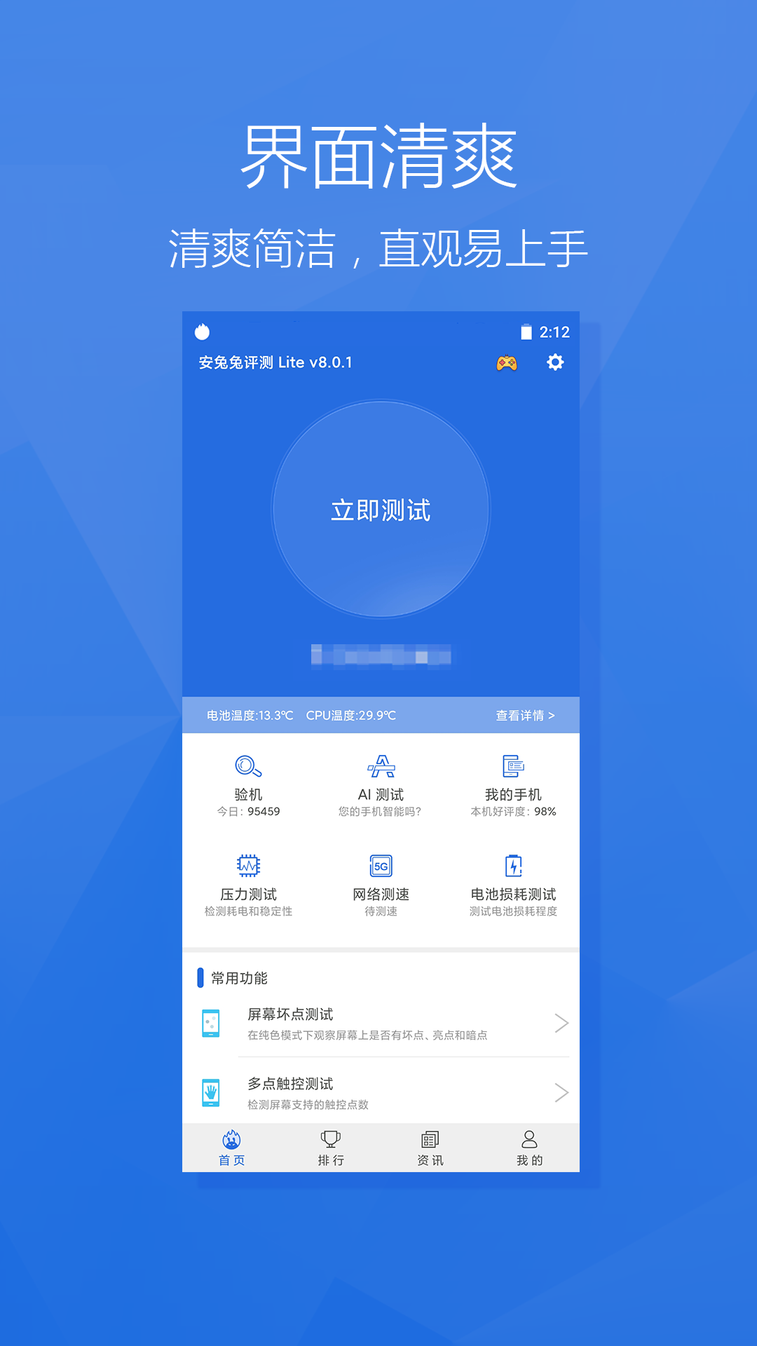 [功能丰富] 跑分、验机、机型评价、屏幕检测、测速、电池损耗等功能;