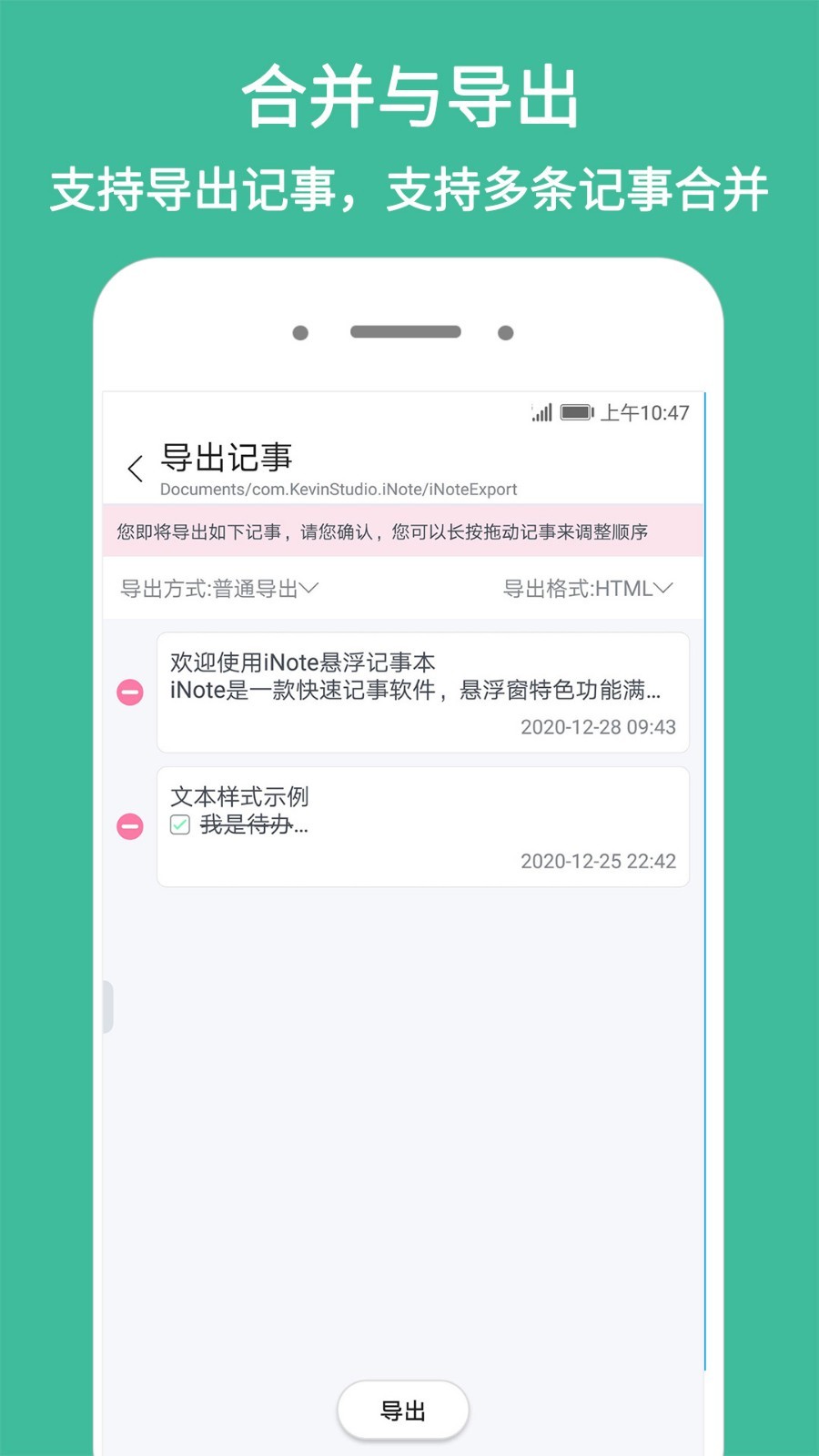 导出能够将一条或多条记事以文件形式导出到手机公共文档目录中。