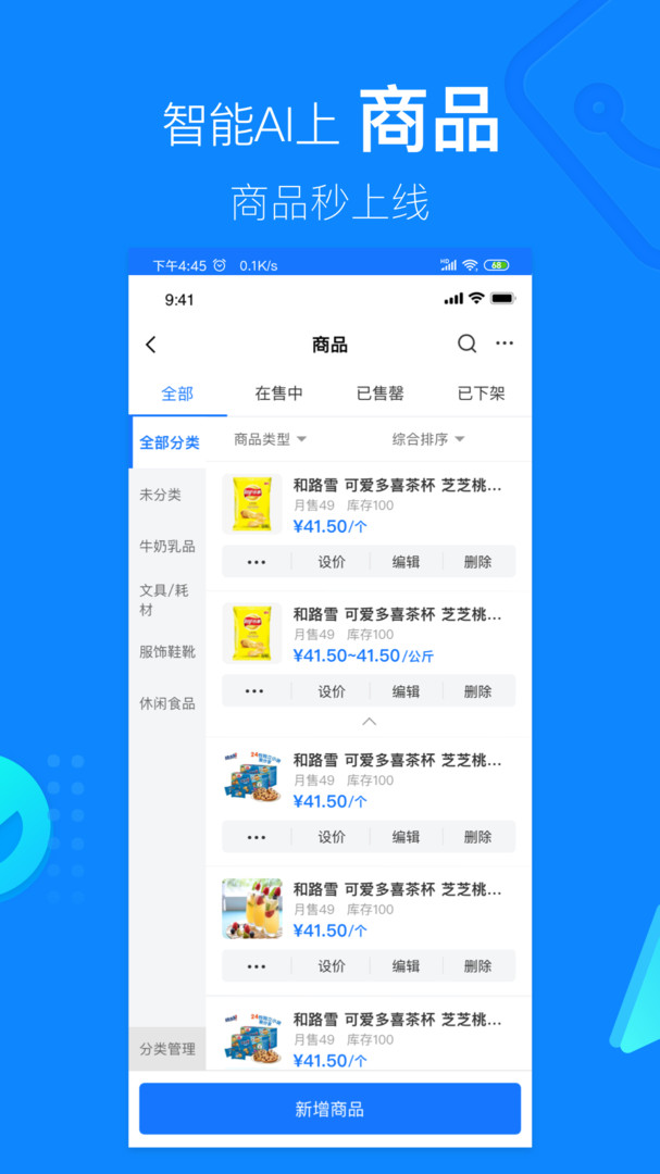 商品:支持设价、编辑商品信息、新增商品、商品上下架,新增/删除/移动商品分类