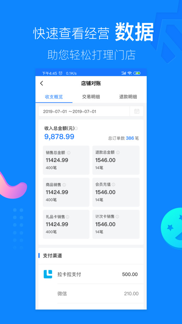 数据:经营分析、员工分析、店铺对账,查看多维度分析报表,实时掌握店铺运营数据