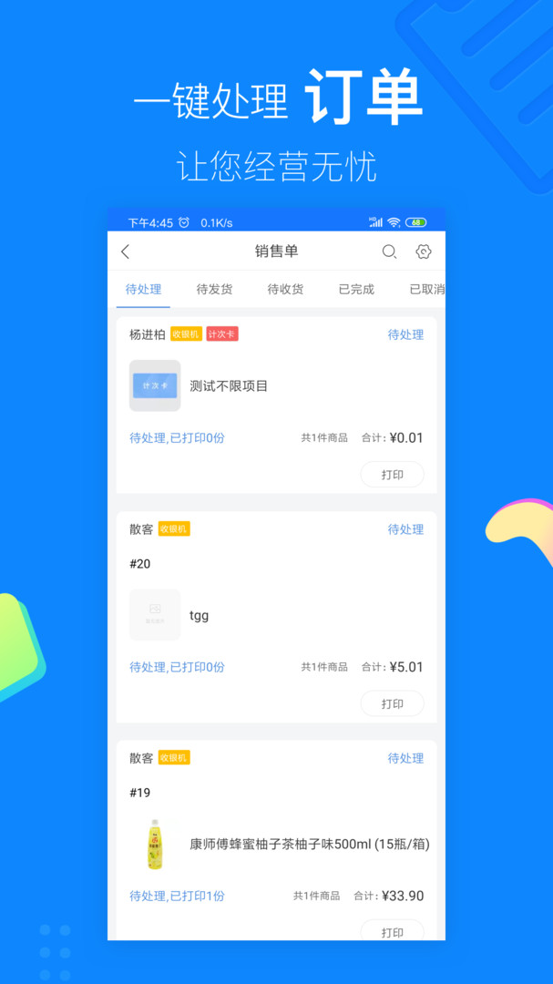 订单:支持对订单进行快速退款、发货、补打小票,上门自提订单可扫码核销