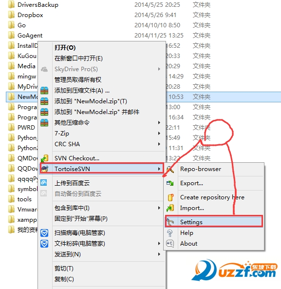 然后鼠标右键点击任意文件夹,或者右键点击桌面,找到TortoiseSVN,并点击“Setting”打开设置界面,