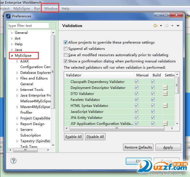 Myeclipse的validation很多,全部验证会导致速度很慢,因此需要去掉不必要的验证。