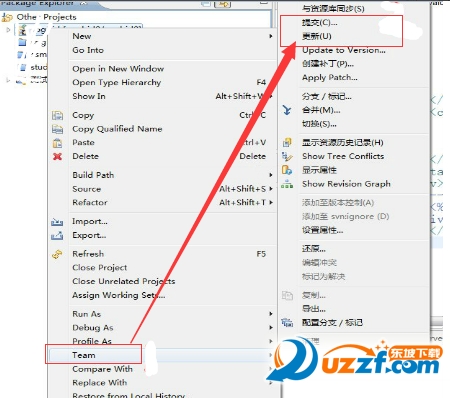 选中要更新的项目或单个文件,右键选择Team,选择更新或提交,最好在提交之前先更新,如果要冲突要打开文件,修改有冲突的部分,删除冲突产生的文件,再次提交就好了。