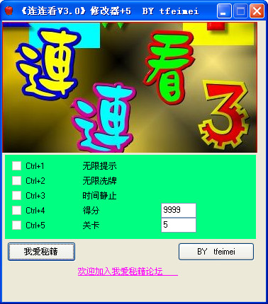 连连看3修改器为您提供了强大的五项修改功能,让你在游戏时可以随心所欲的操作,体验更加自由更加刺激的游戏过程,让你通关更容易,消分更轻松。