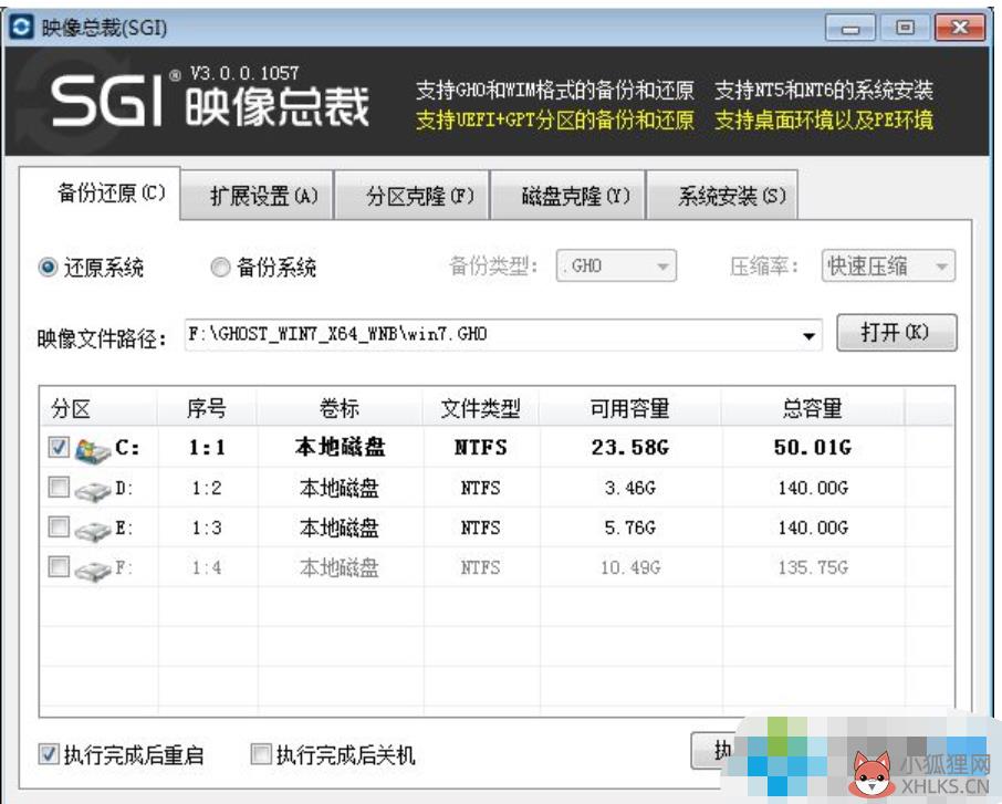 4、双击【安装系统.exe】打开这个安装界面,选择【还原系统】,映像文件路径选择win7.gho文件,勾选要安装的位置C盘,如果不是显示C盘,要根据卷标或容量来判断C盘,再勾选【执行完成后重启】,最后点击【执行】;